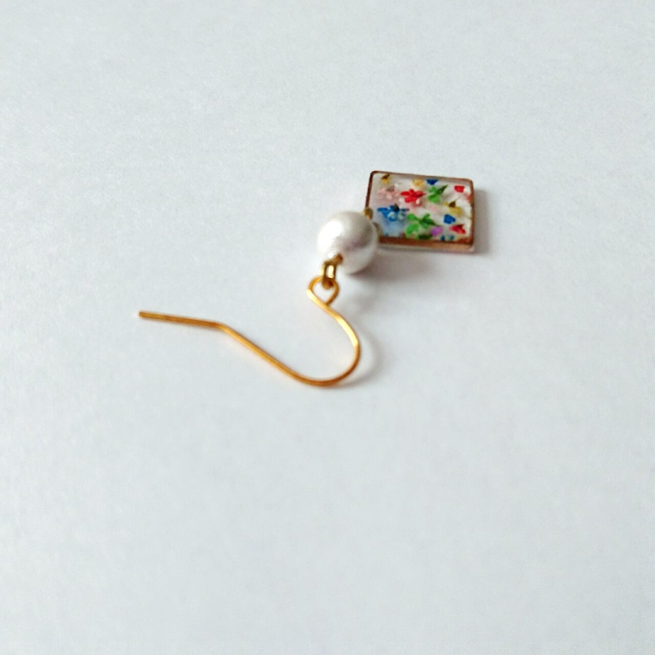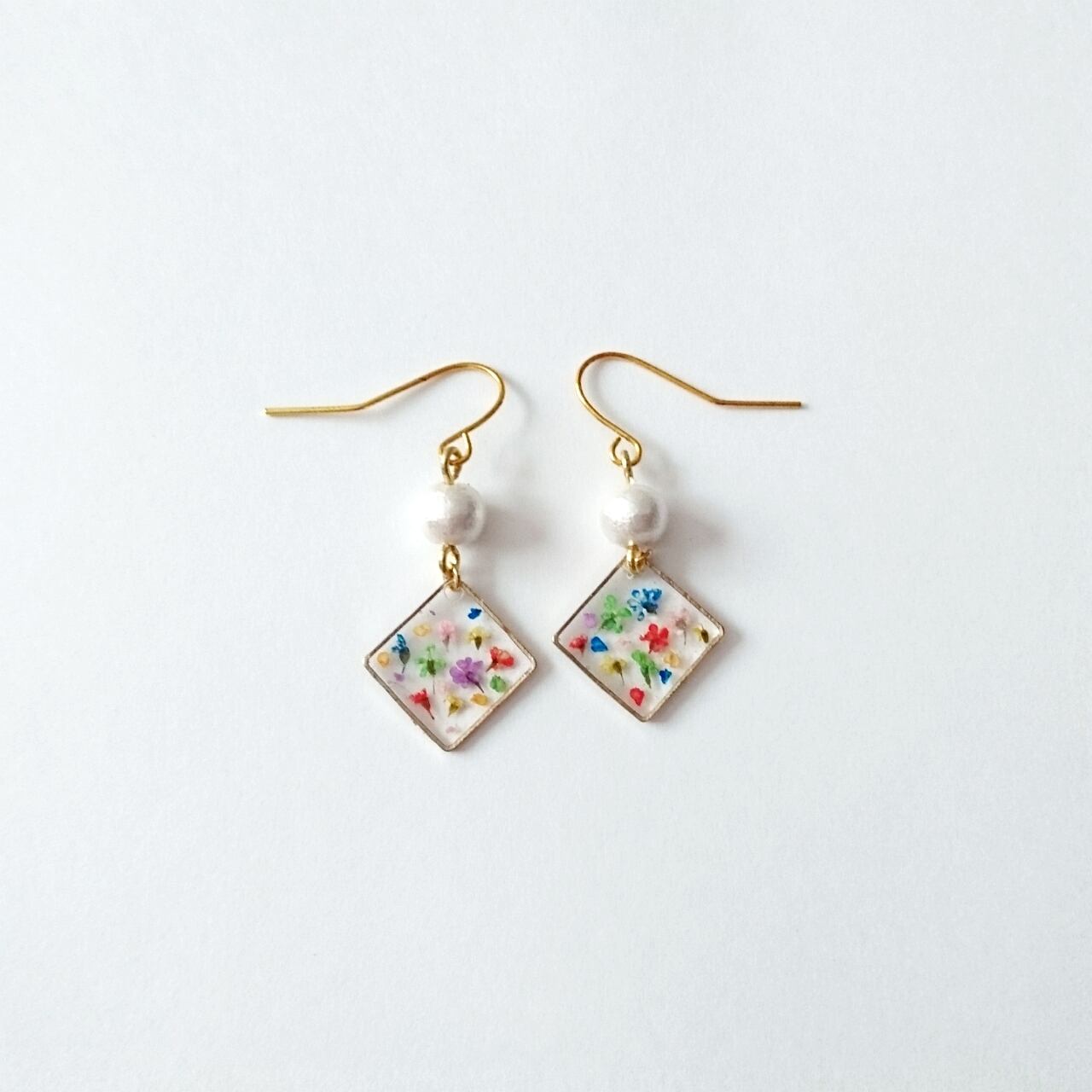 スクエアのフレームにカラフルな小花を閉じ込め、コットンパールと合わせたピアスです。