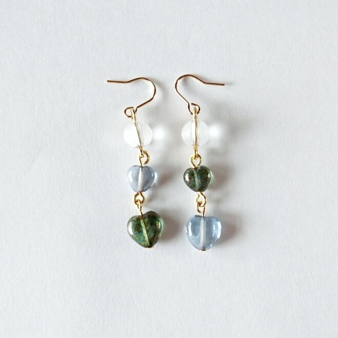 モスグリーンとブルーのハート型のチェコビーズにガラスビーズを合わせたピアスです。